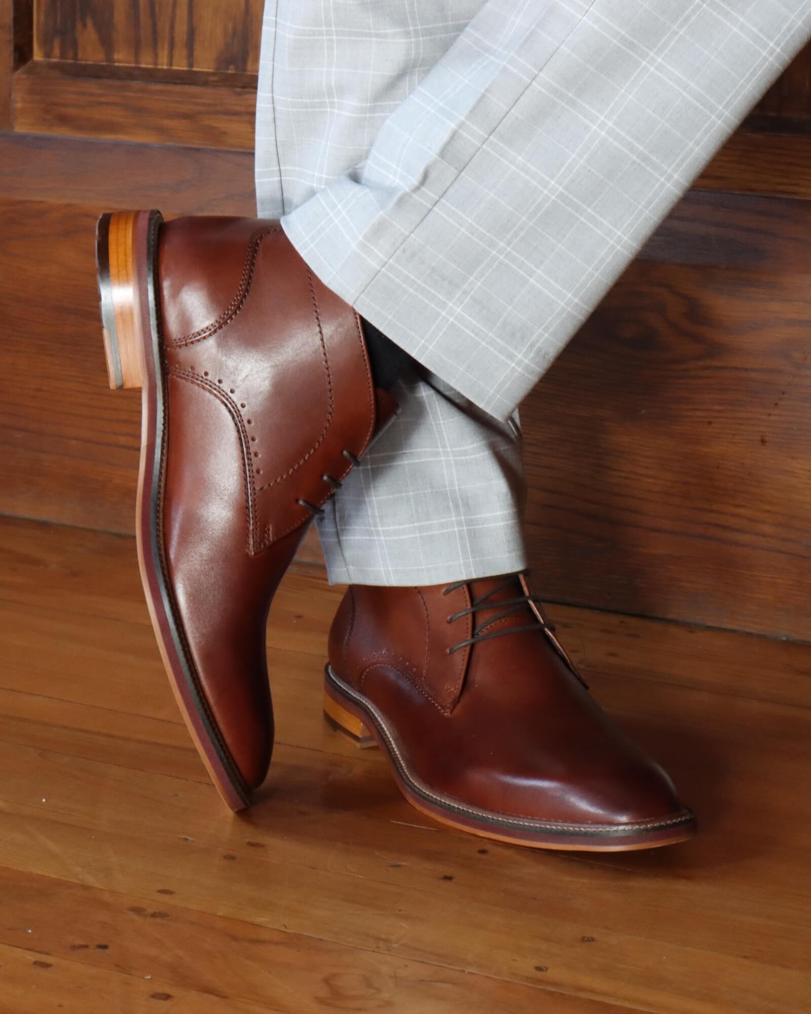 • Brown leather dress shoes on a wooden floor