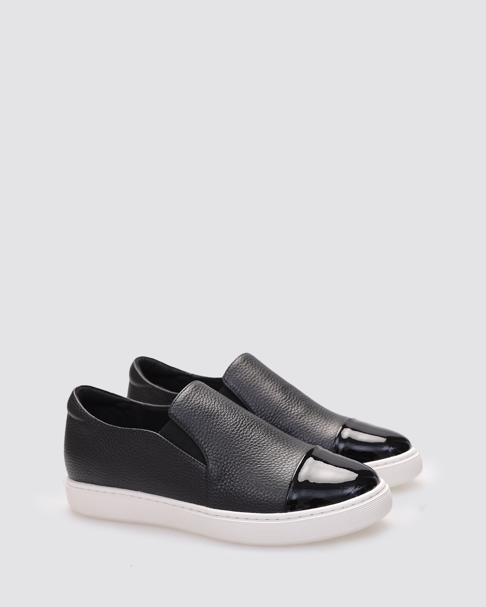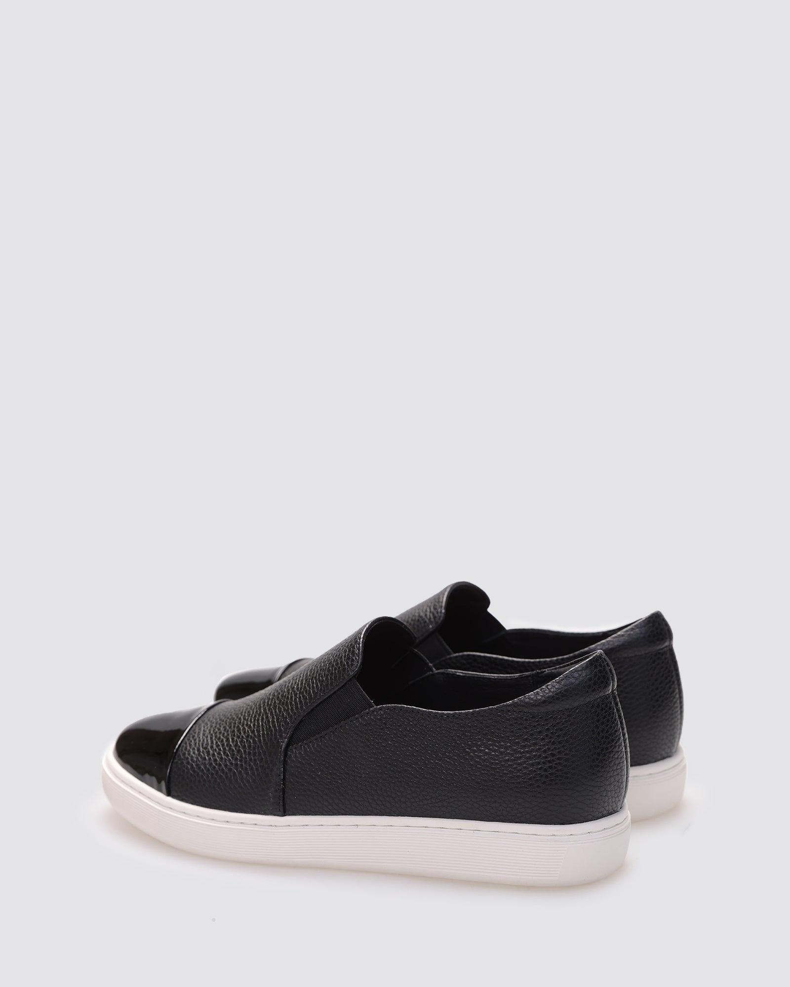 Icepoppy is the perfect mix of casual cool and polished detail. Featuring a glossy patent toe cap against a supple leather upper, this black sneaker is finished with a crisp white sole for a contemporary contrast. Elastic gussets make it easy to slip on, while the almond toe shape flatters every foot.