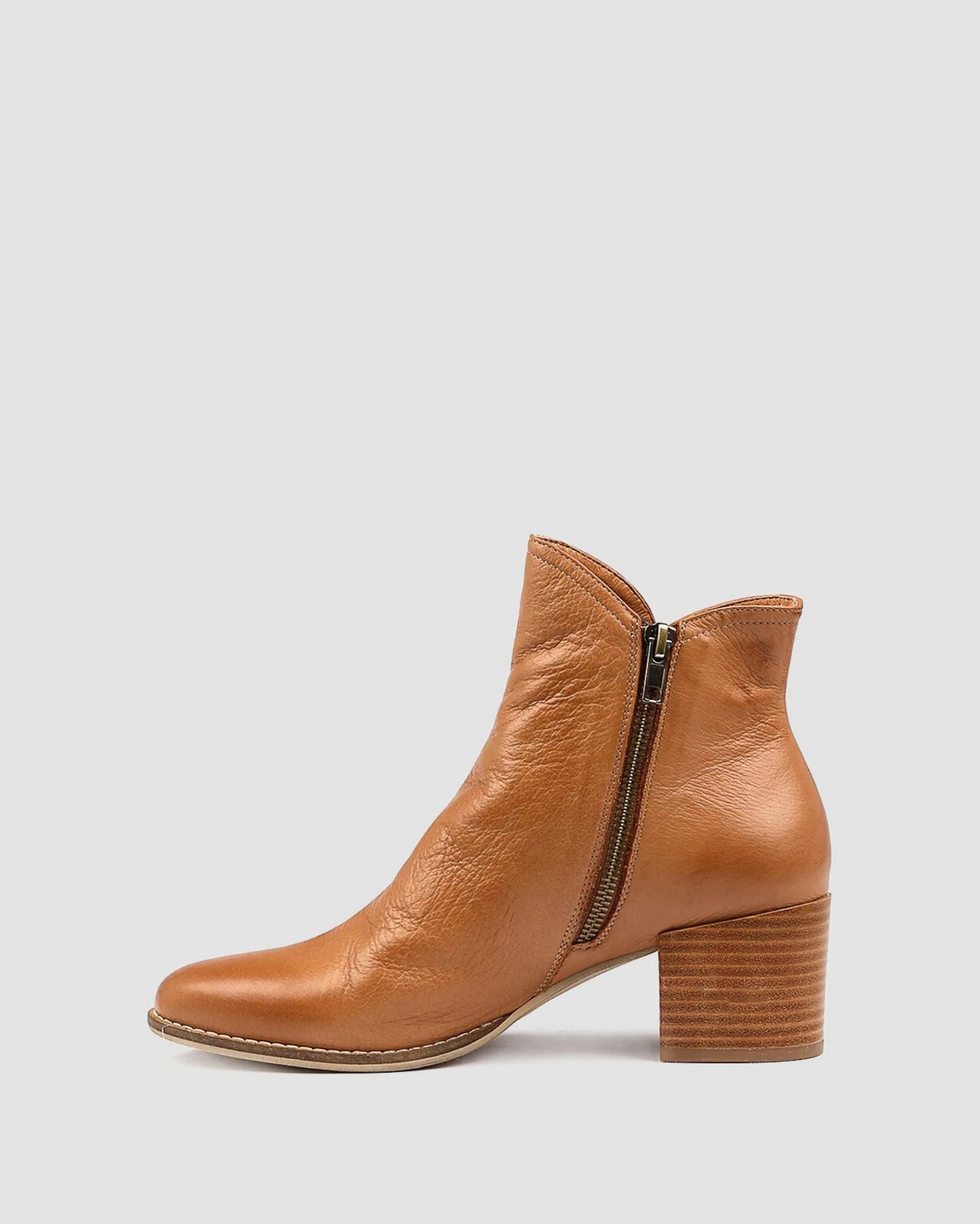 Mockas in Dark Tan by Django & Juliette are leather ankle boots with an inside zip, making slipping them on effortless and a stacked heel that makes you feel grounded. Pairs with jeans, skirts, or tailored pants.