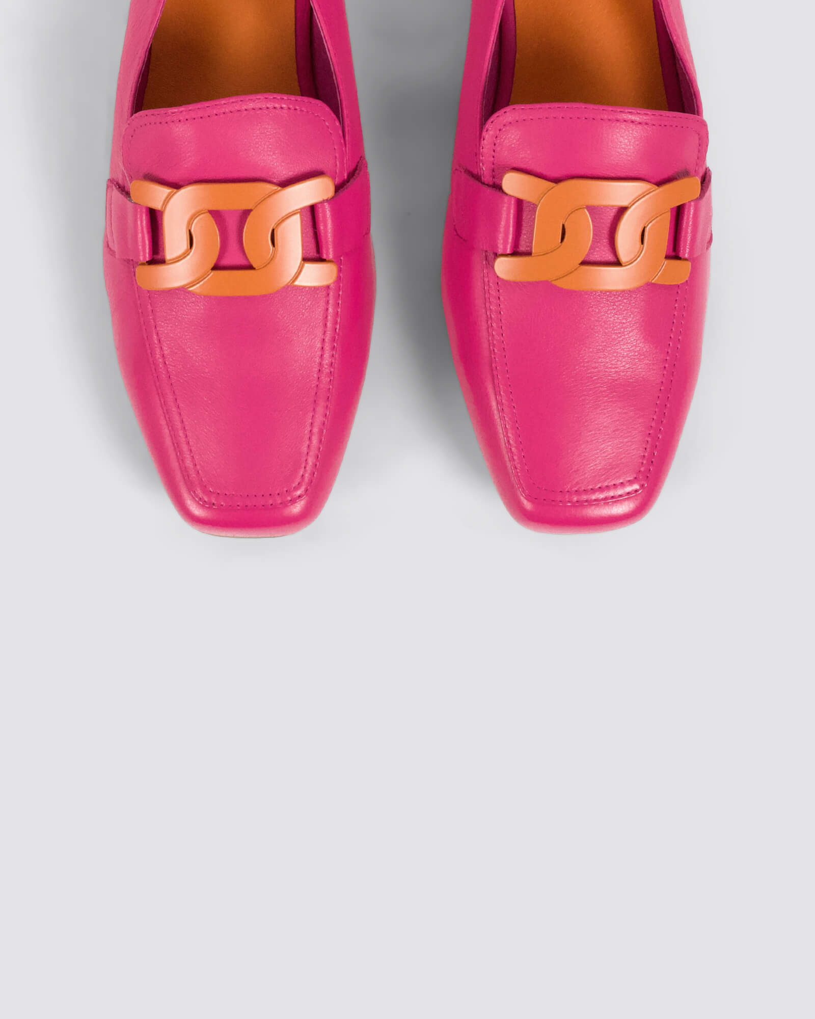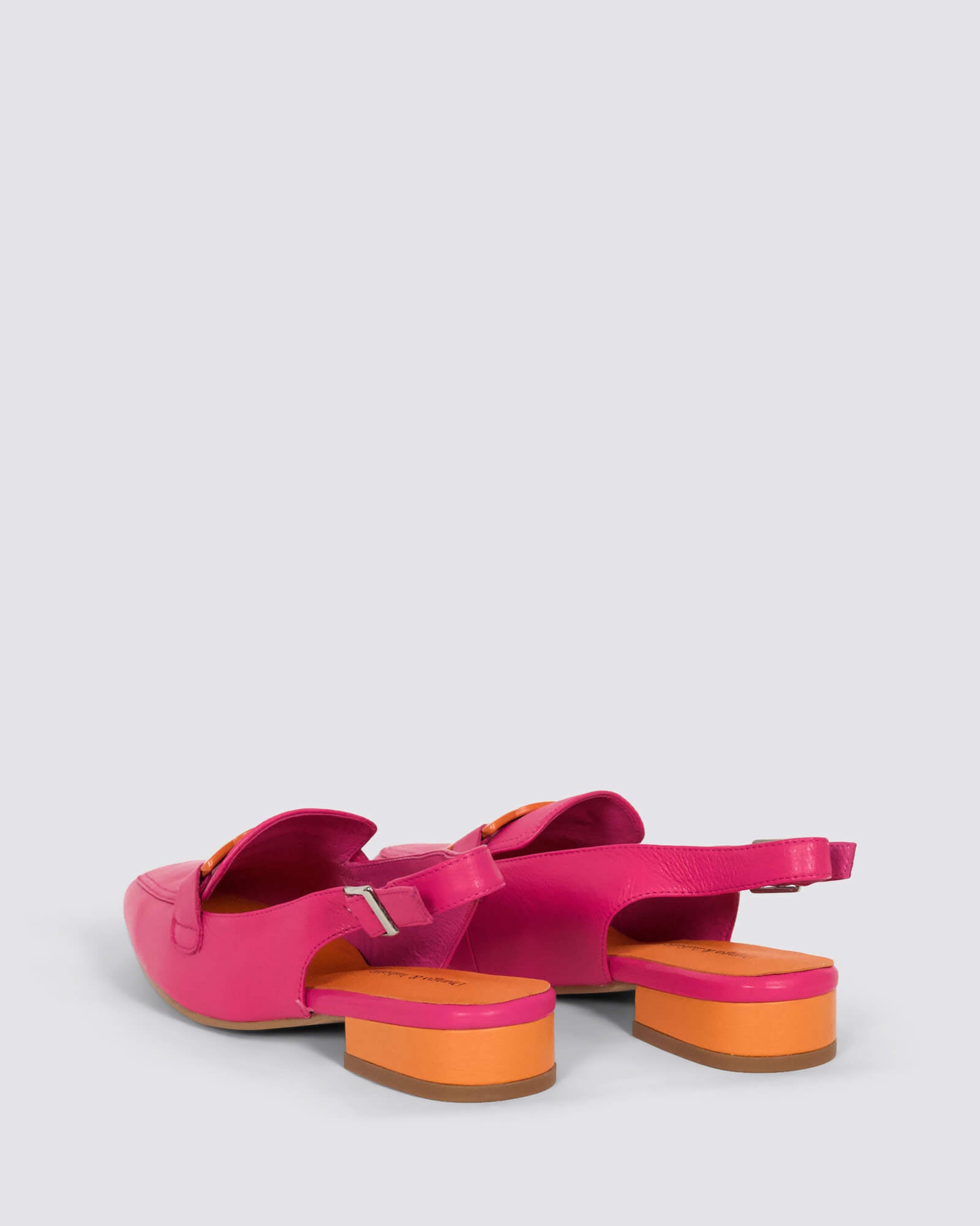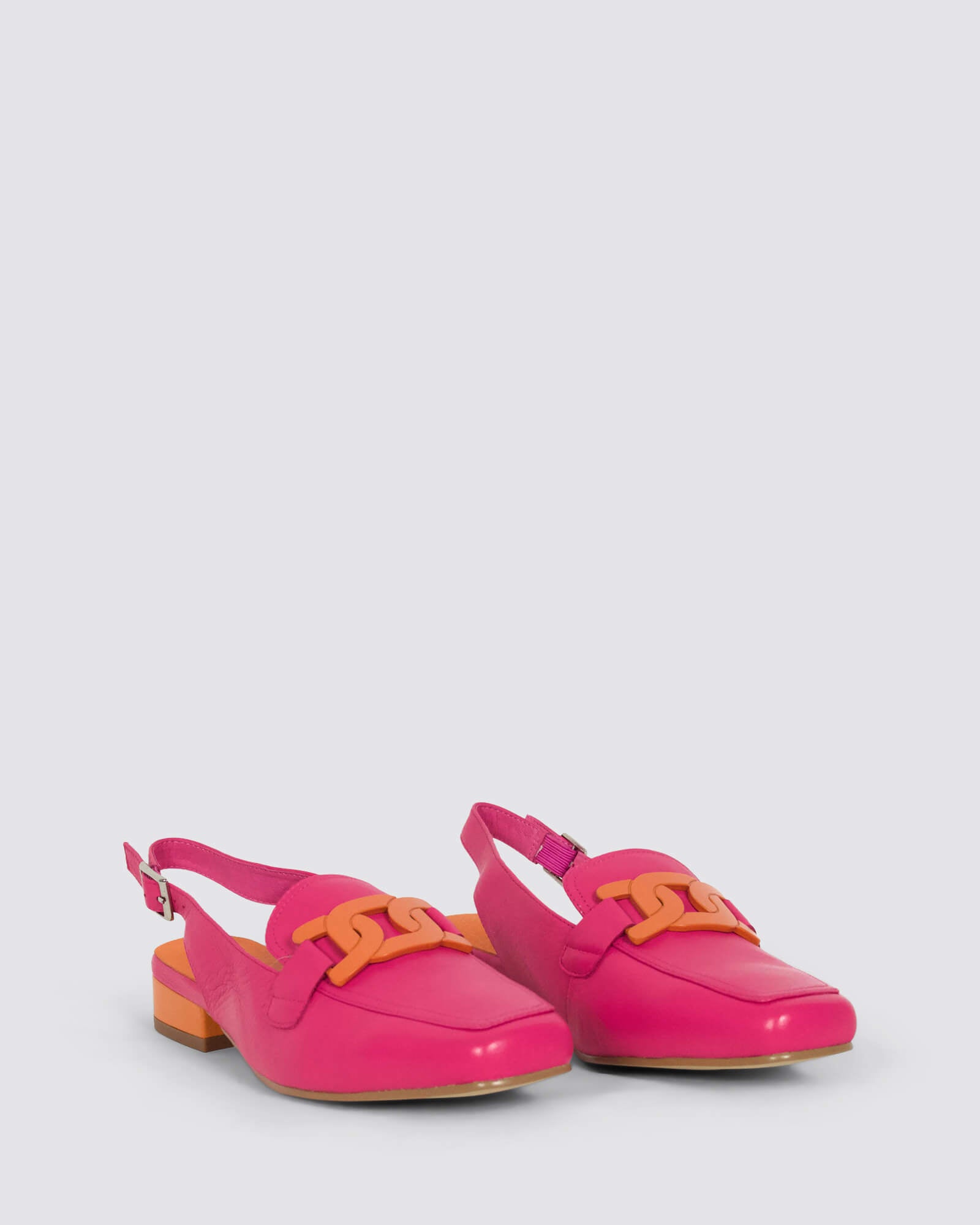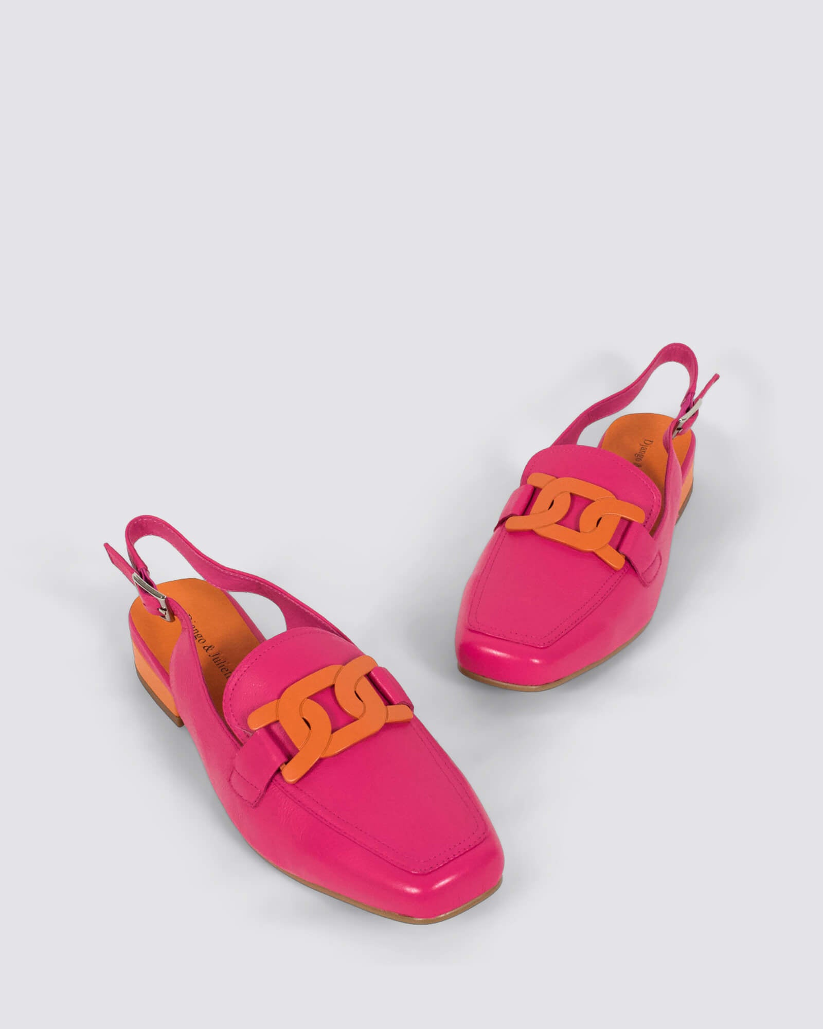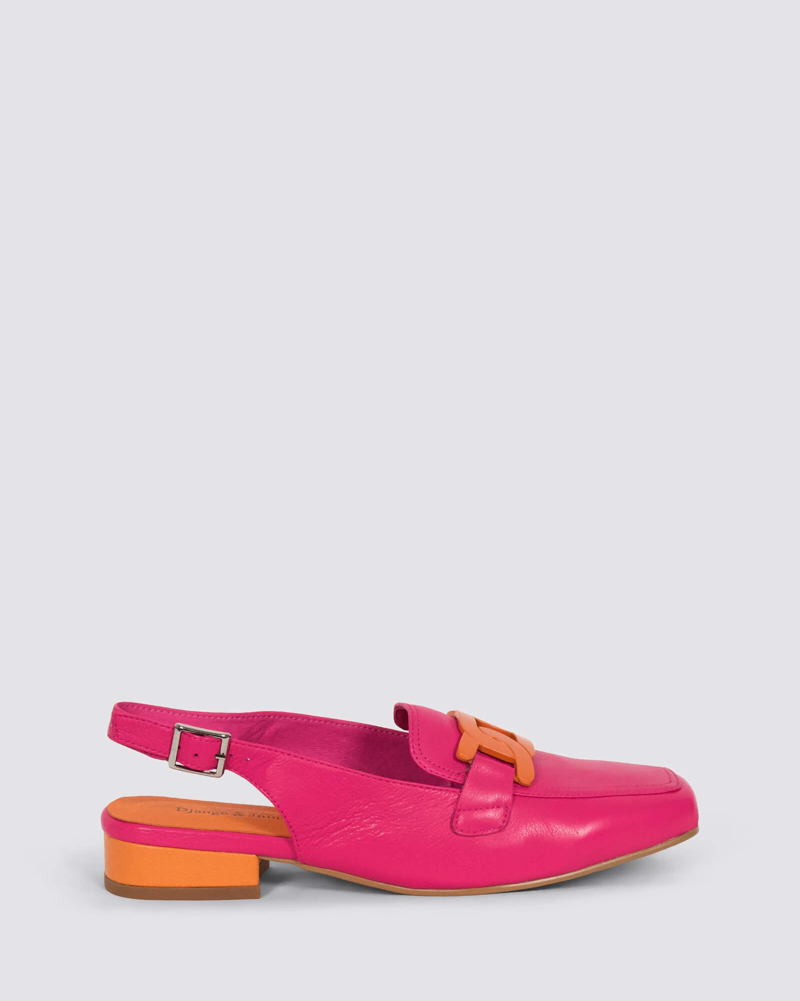 Django & Juliette Bossys Fuchsia Orange leather slingback loafers feature a 2.5cm heel, elasticated strap, and chain embellishment - perfect for stylish office or weekend looks. Pairs beautifully with skirts, trousers, or midi dresses