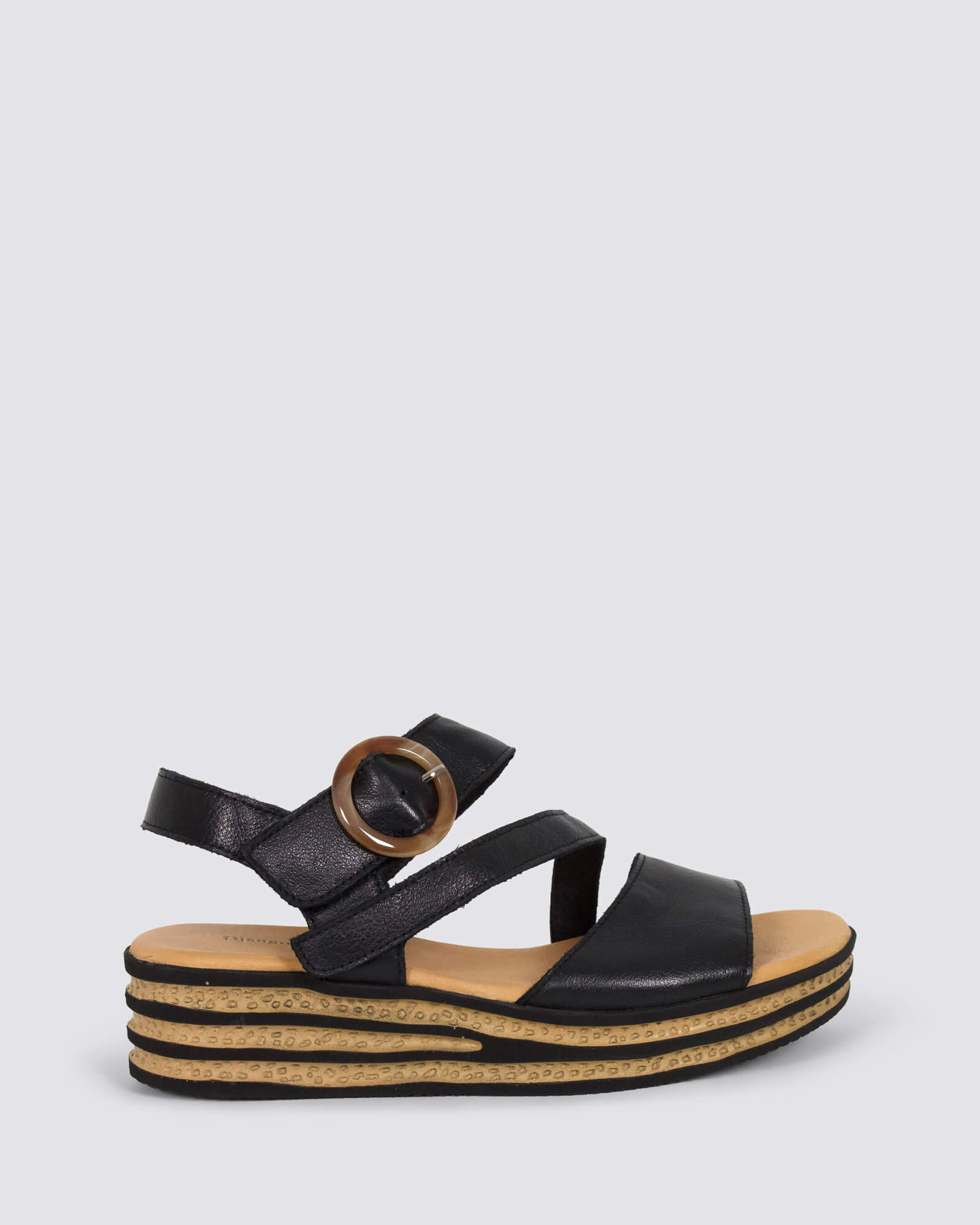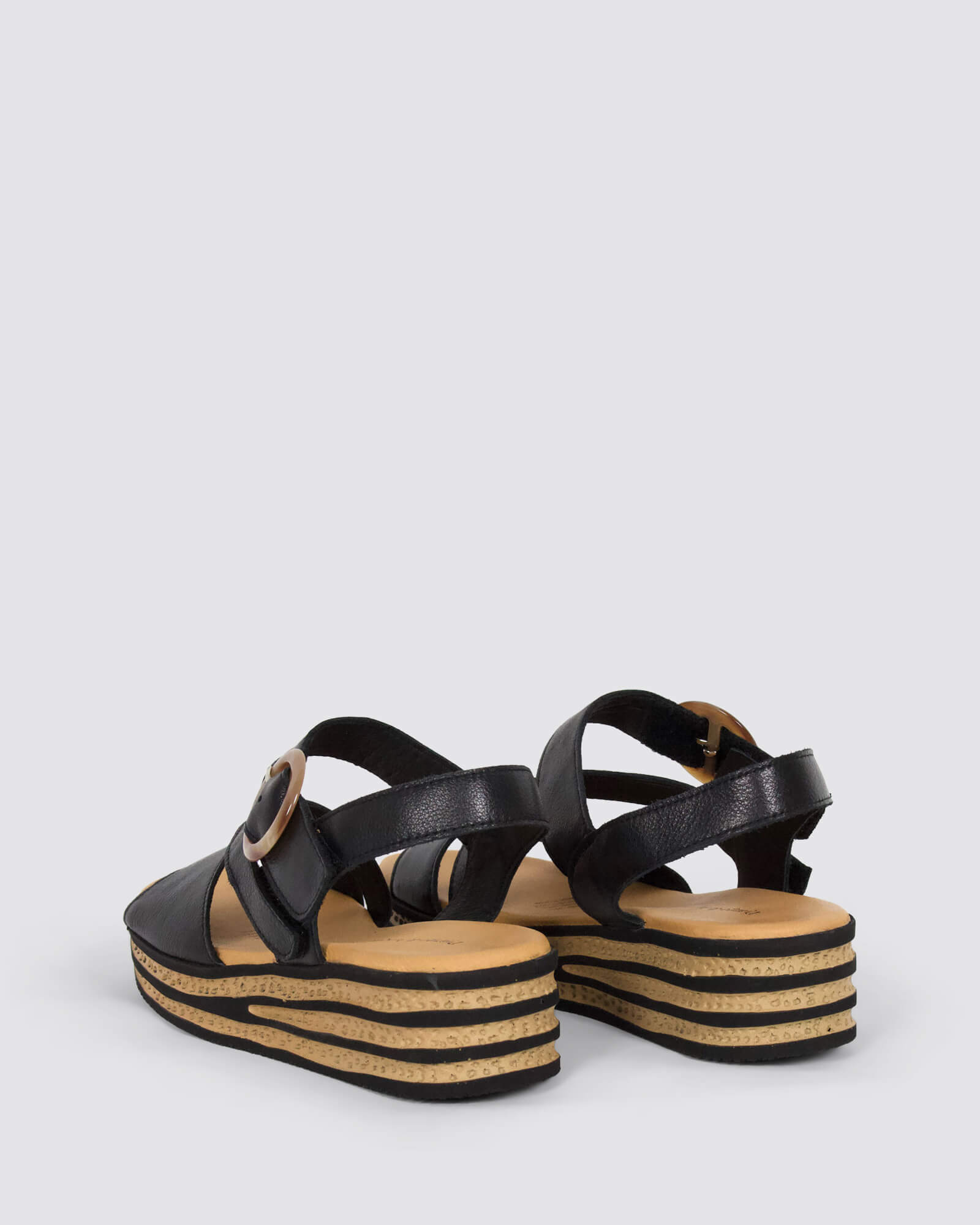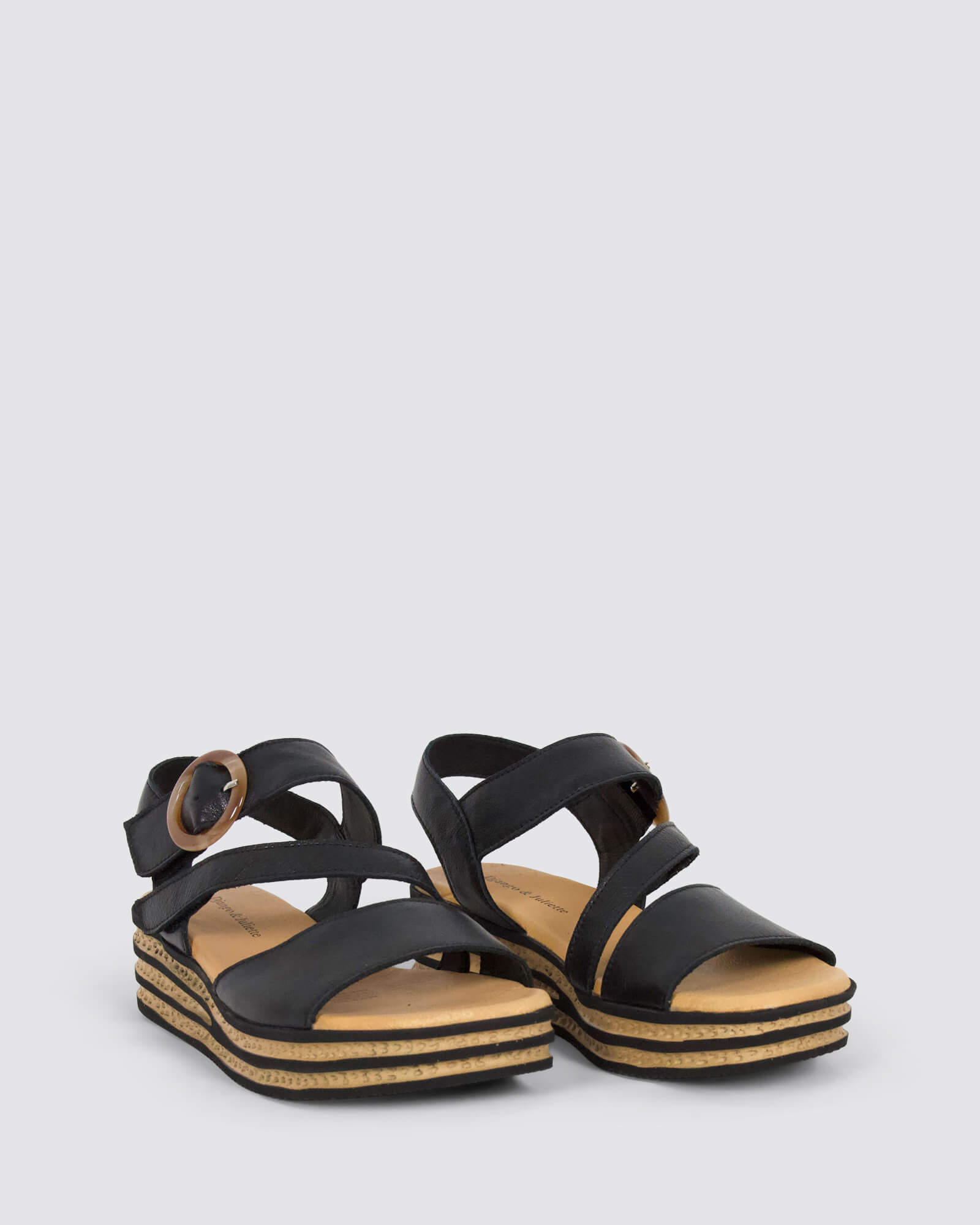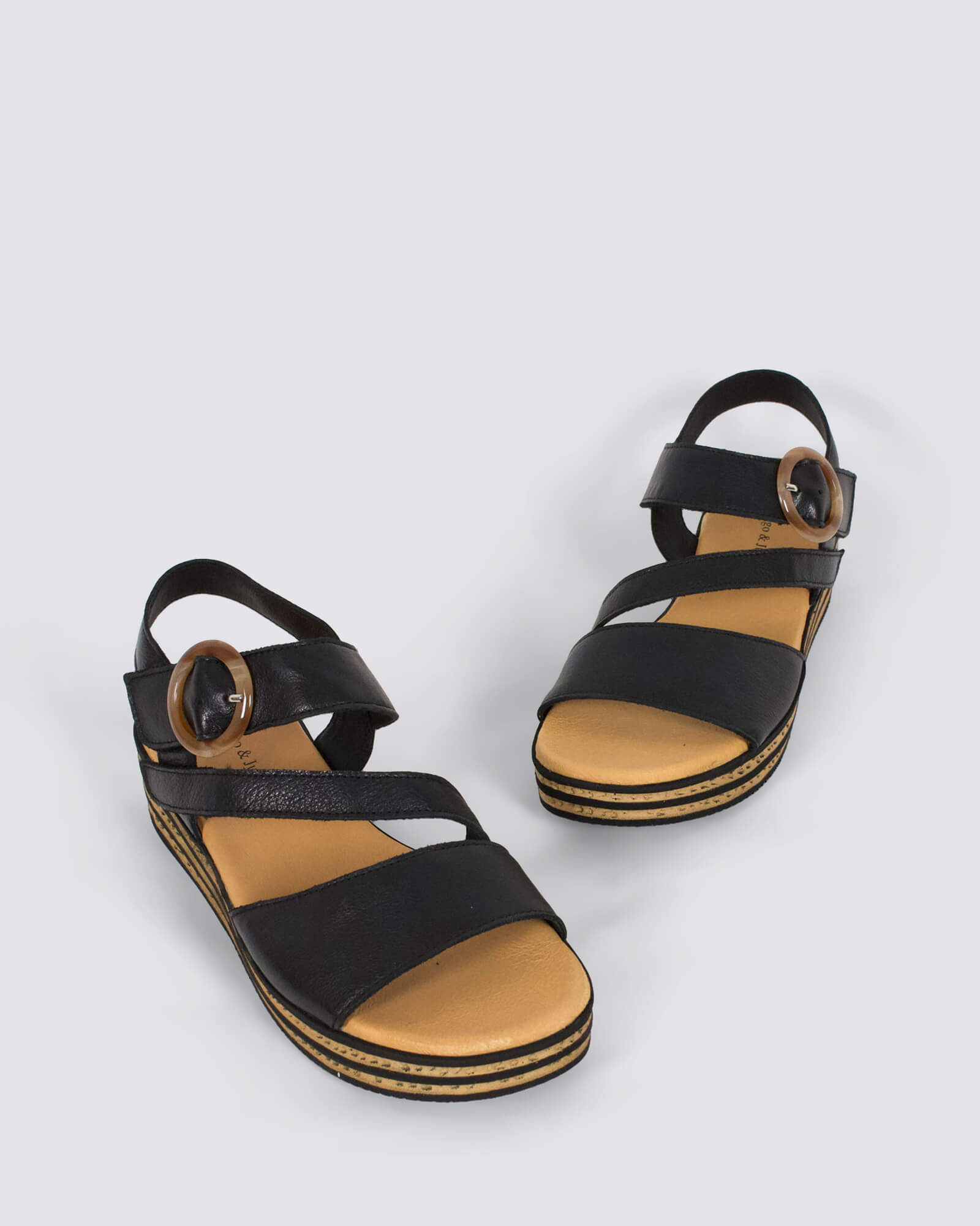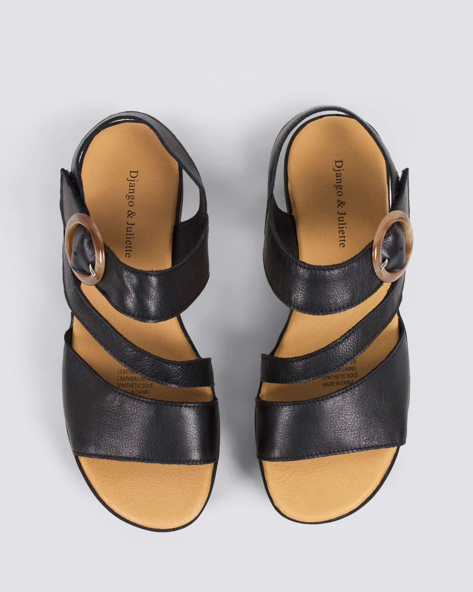 Django & Juliette Charleen black leather sandals feature a 4cm thick sole, adjustable diagonal and ankle straps - perfect for day-to-night summer styling. Pair seamlessly with skirts, dresses, or cropped trousers for a chic daytime or evening look.