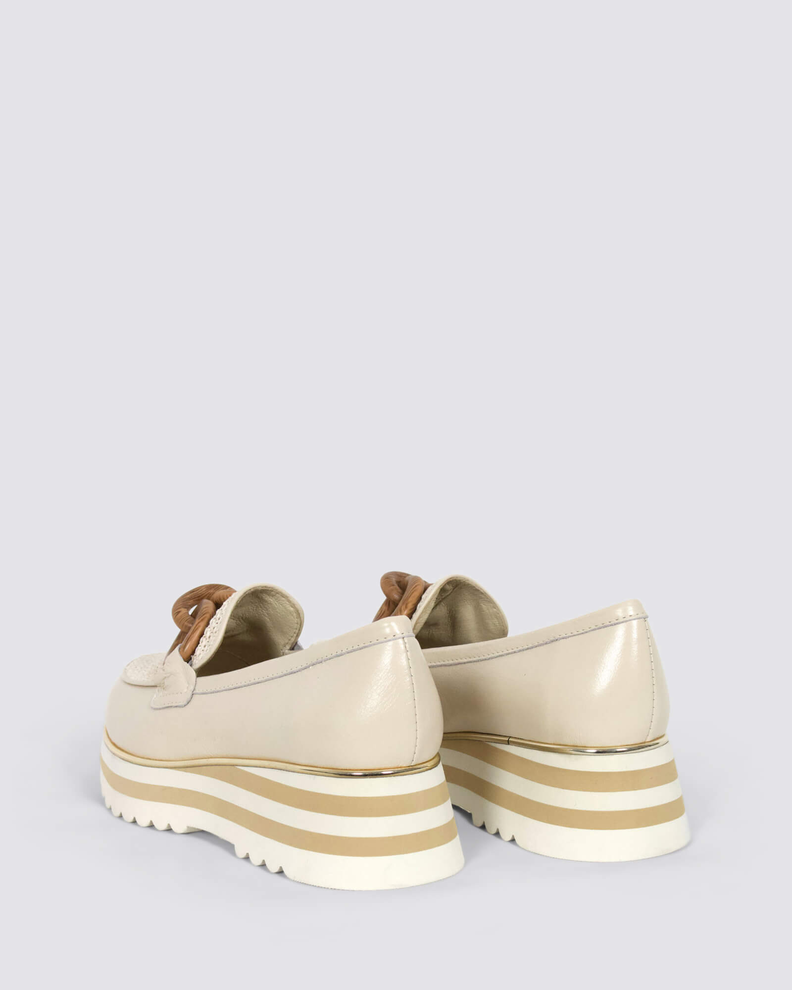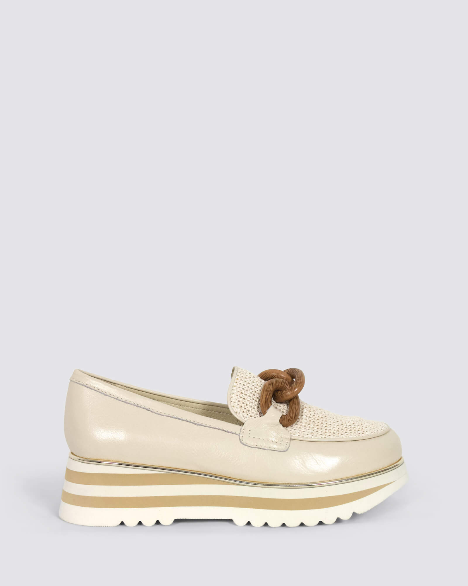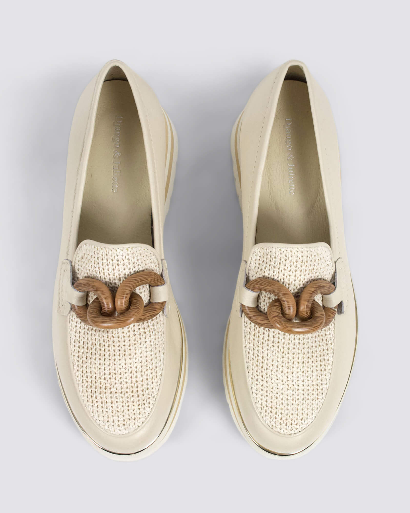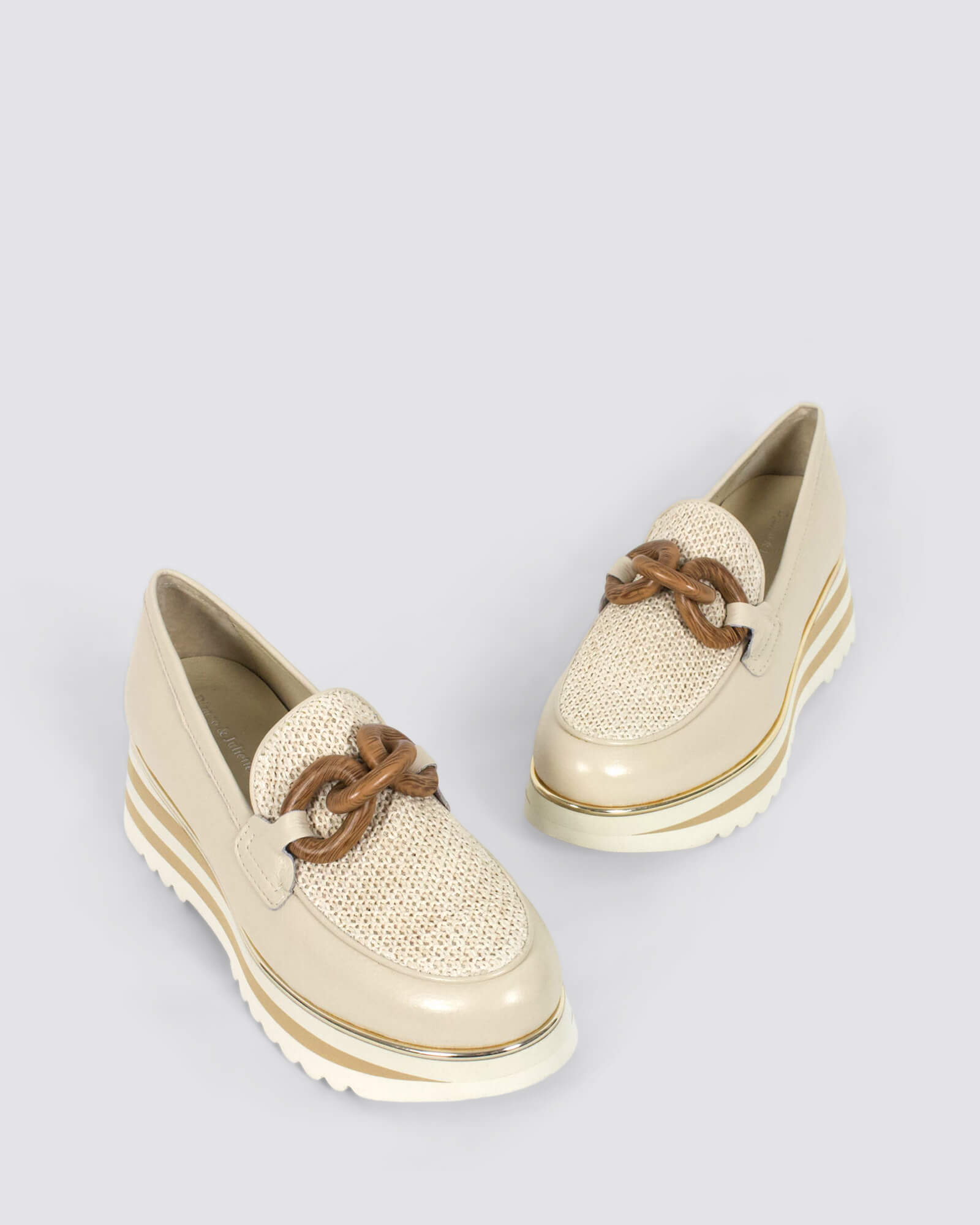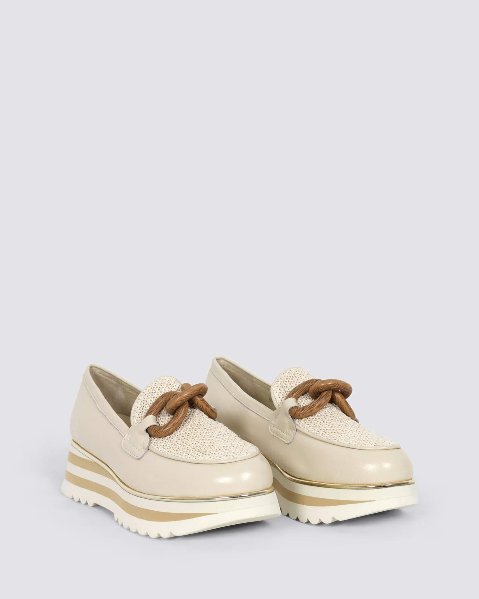 Django & Juliette Eggey ivory leather platform loafers feature a 5.3cm striped sole, leather footbed, and woven raffia details - perfect for brunches, city walks, or casual events.