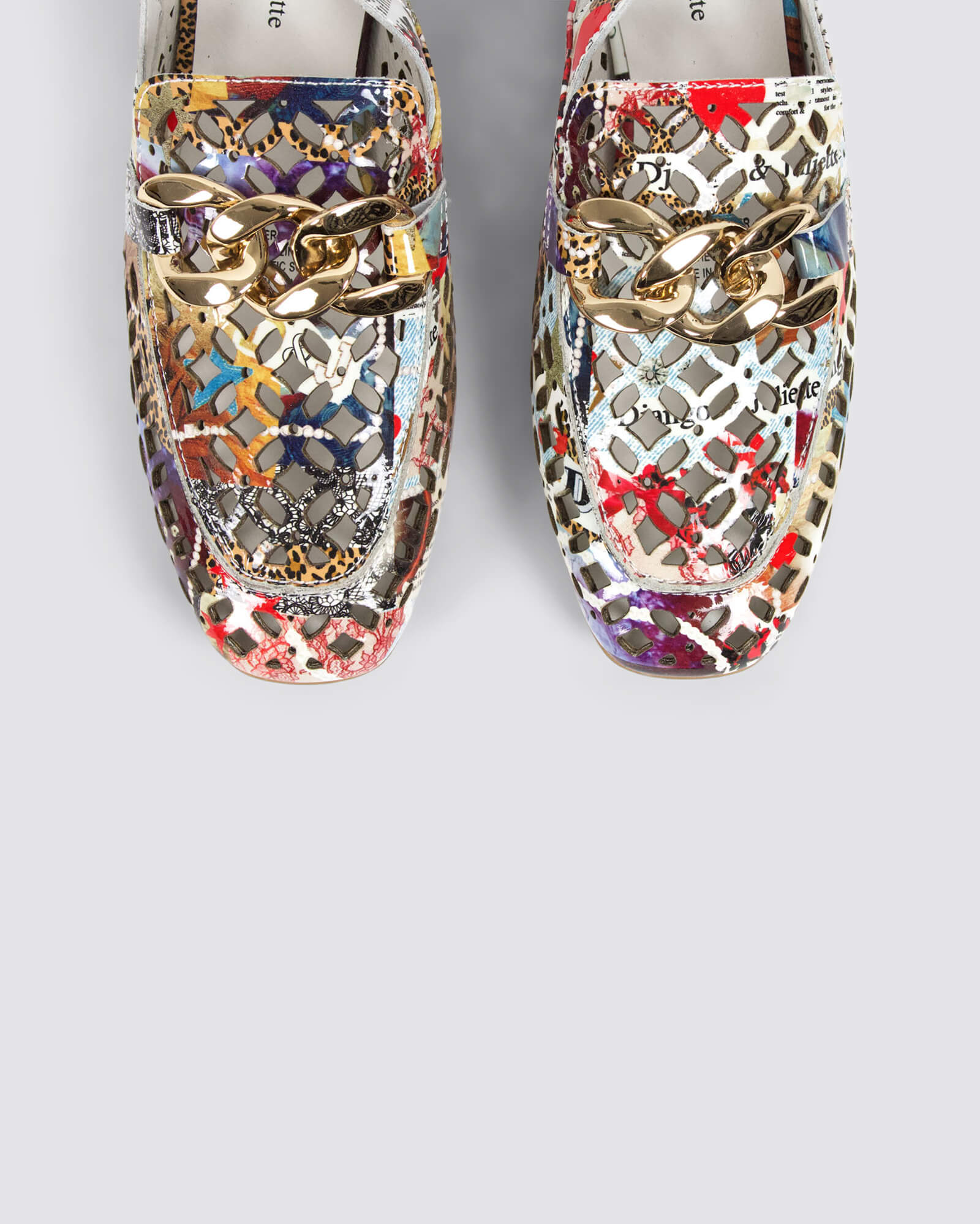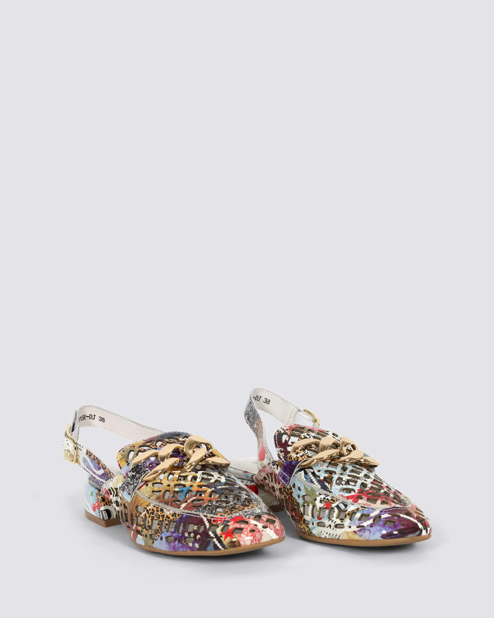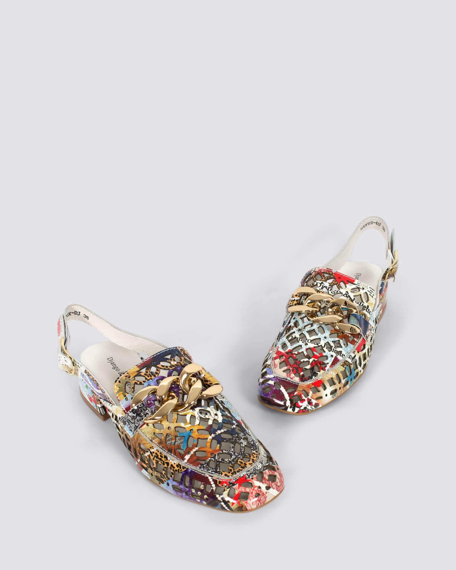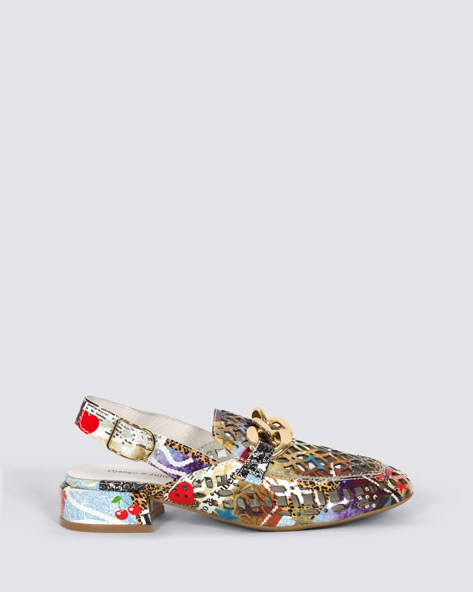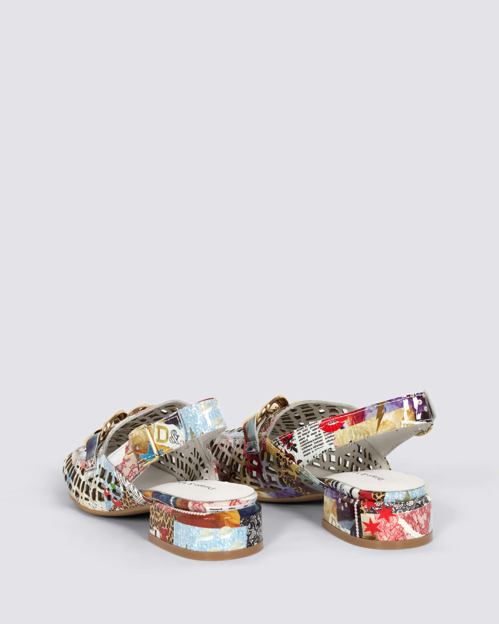 Django & Juliette Vooper in collage print patent leather heels feature a 3.3cm block heel, buckled slingback, and metallic hardware - Pair with tailored trousers, midi dresses, or skirts for a versatile city-to-dinner look.