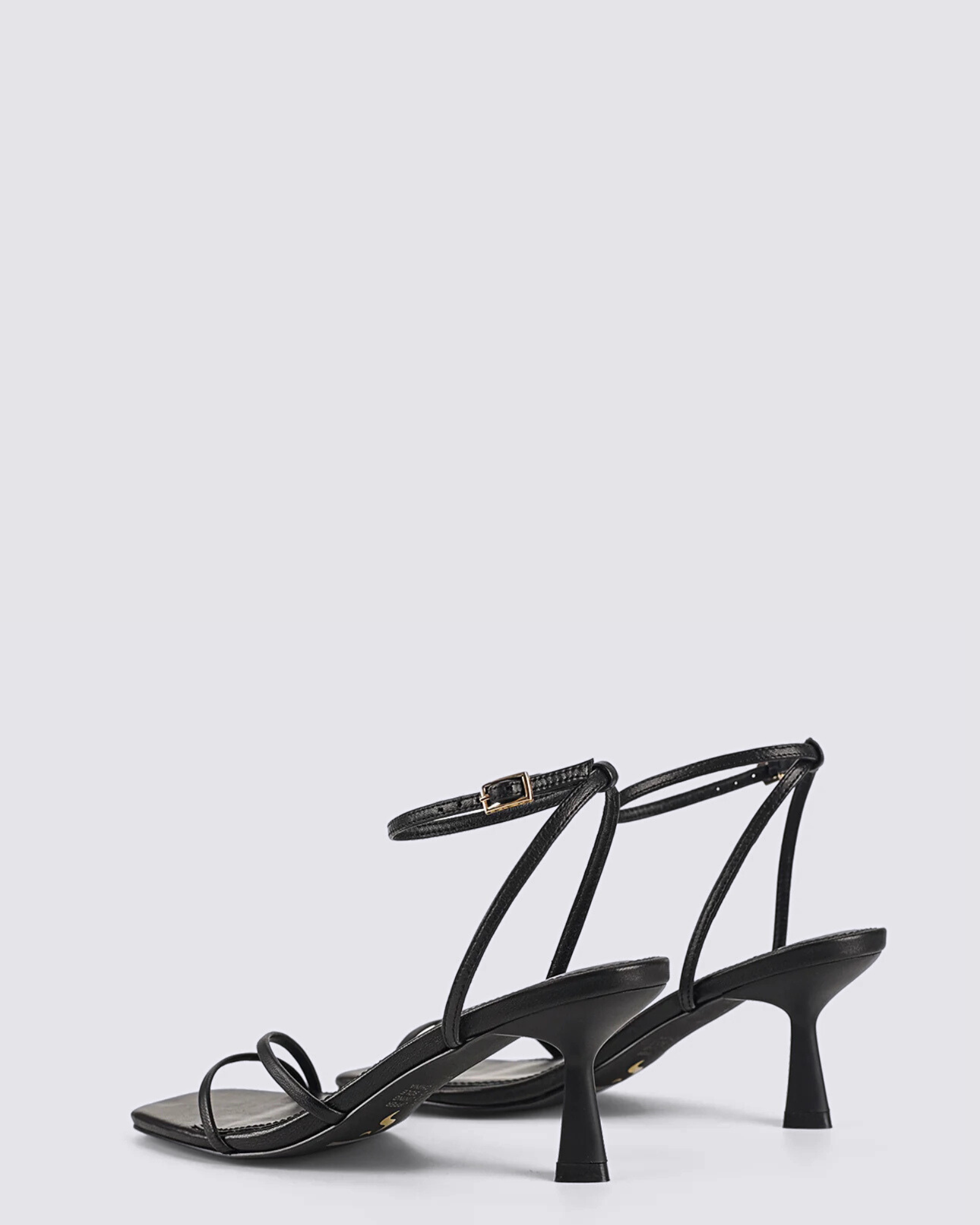 The Saffron Strappy Heels in black leather by Siren offer a barely-there silhouette, wrap-around ankle strap and 6cm heel - ideal for events, long lunches and evenings out.