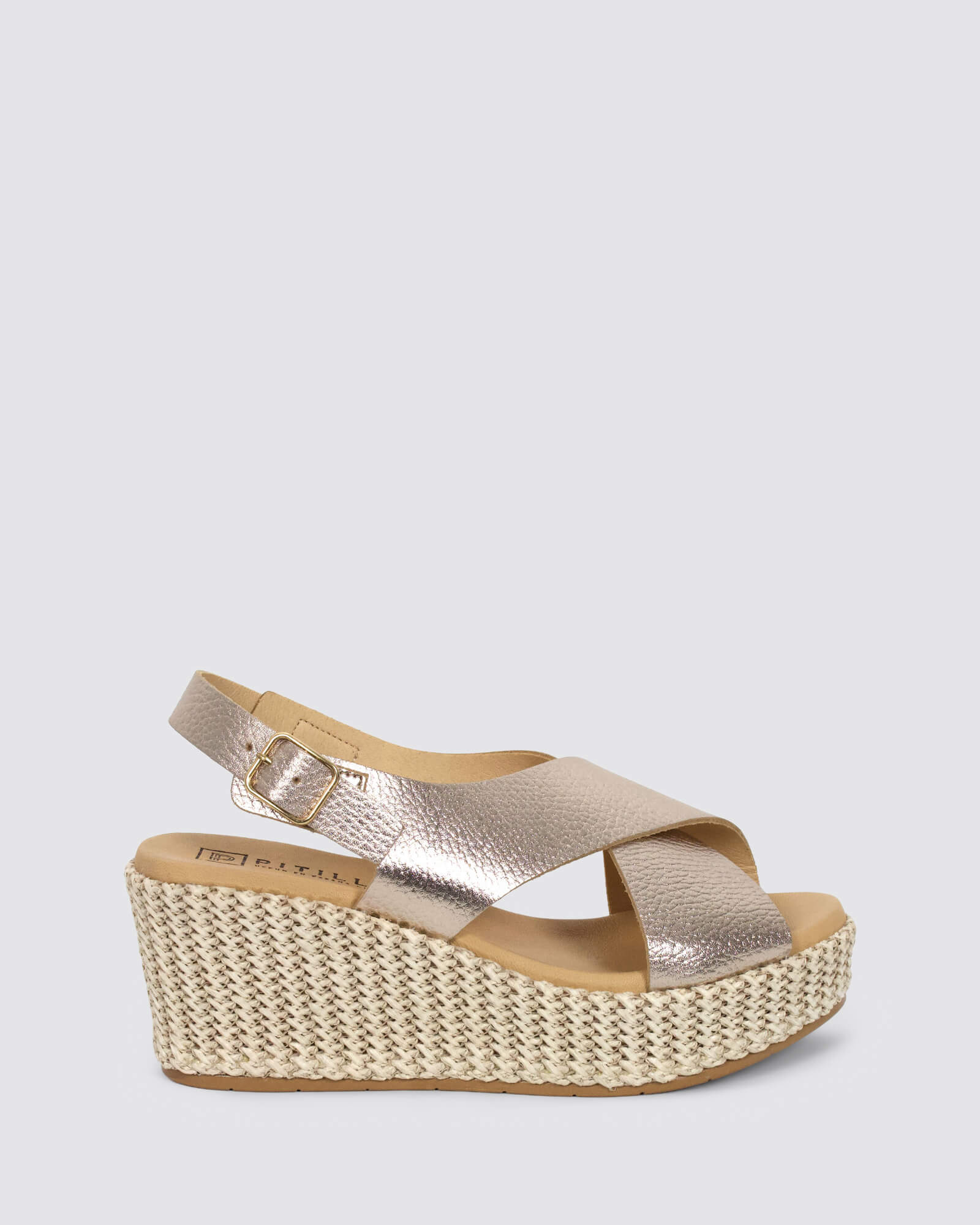 10570 wedge sandals in Oro Metallic by Pitillos feature a 7 cm wedge with a 3.5 cm platform, criss-cross straps, and adjustable buckle. Chic, secure, and perfect for summer gatherings.