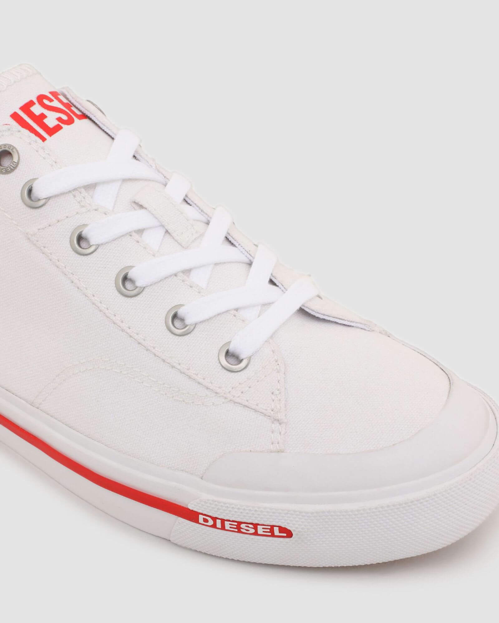 Diesel Athos Low men's sneakers in white feature a washed canvas upper, vulcanised rubber sole, and red logo detailing - an easy everyday men’s trainer that will become a staple in your wardrobe.