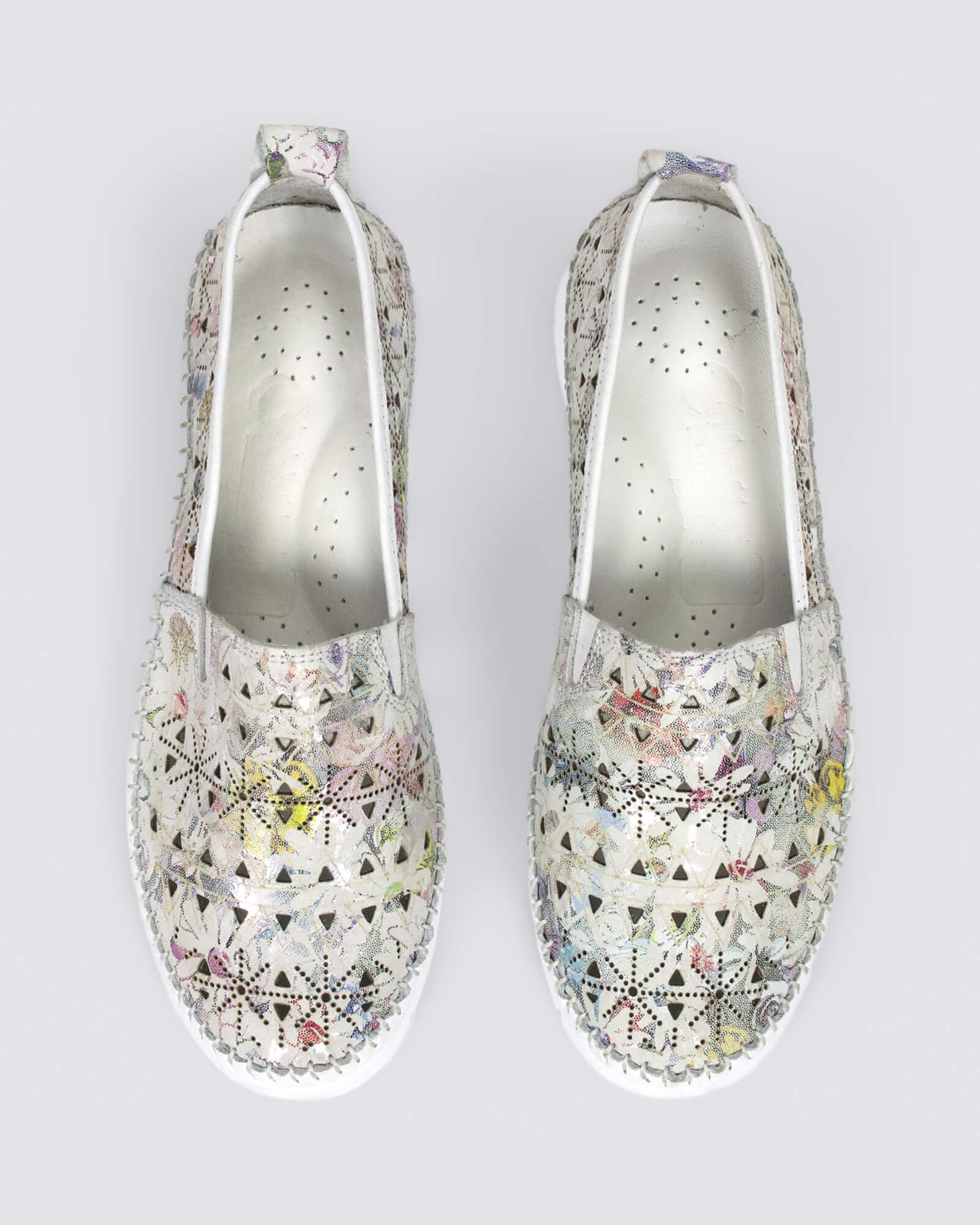 A breezy summer loafer, the Cabello Clear in White Print features supple leather, laser-cut detailing, and a cushioned rubber sole. Perfect slip-on comfort for everyday wear.