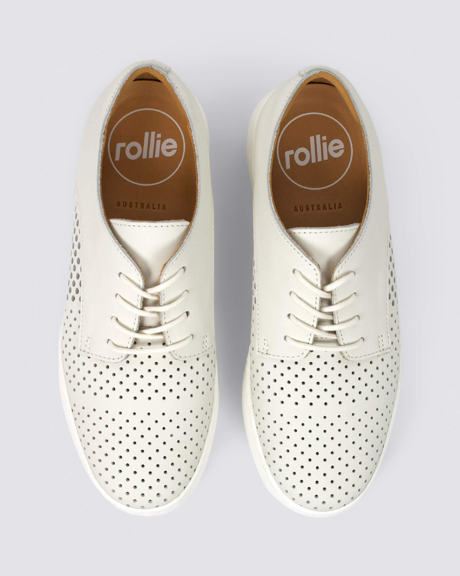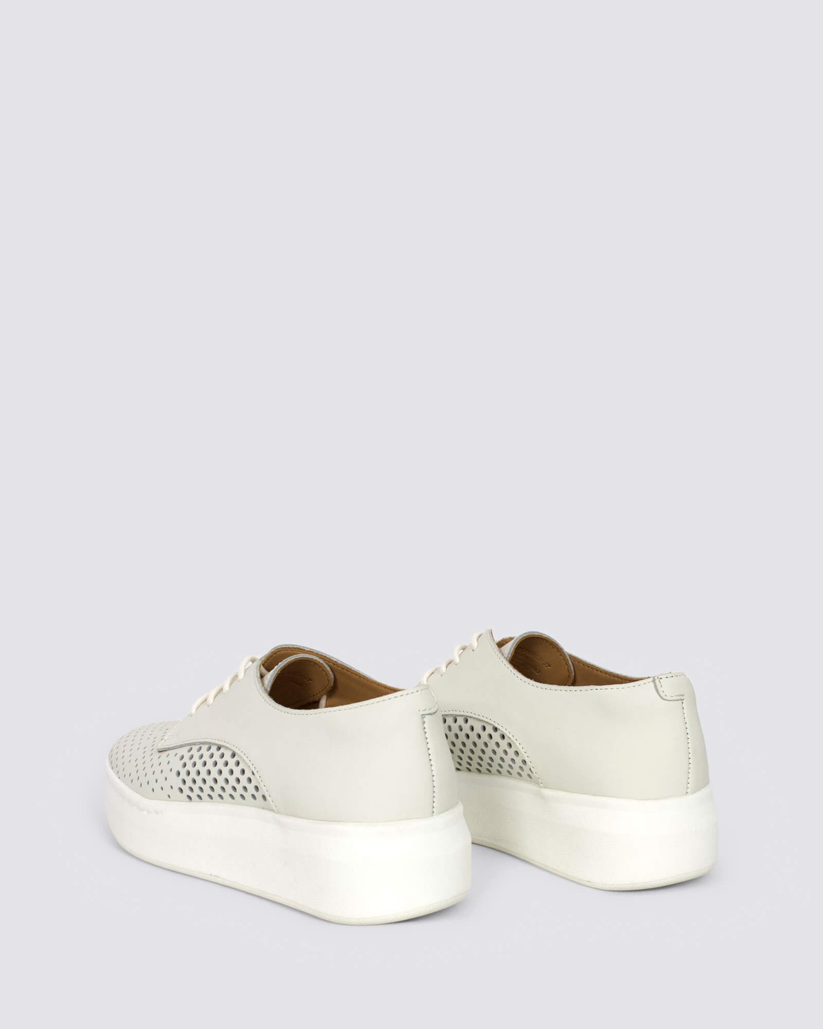 A playful twist on the classic Derby, this white platform sneaker delivers height without the heaviness. The smooth leather, padded collar and elasticated fit offer instant comfort, while the generous toe box makes it ideal for wider feet. A fun, functional lace-up made for all-day roamers.