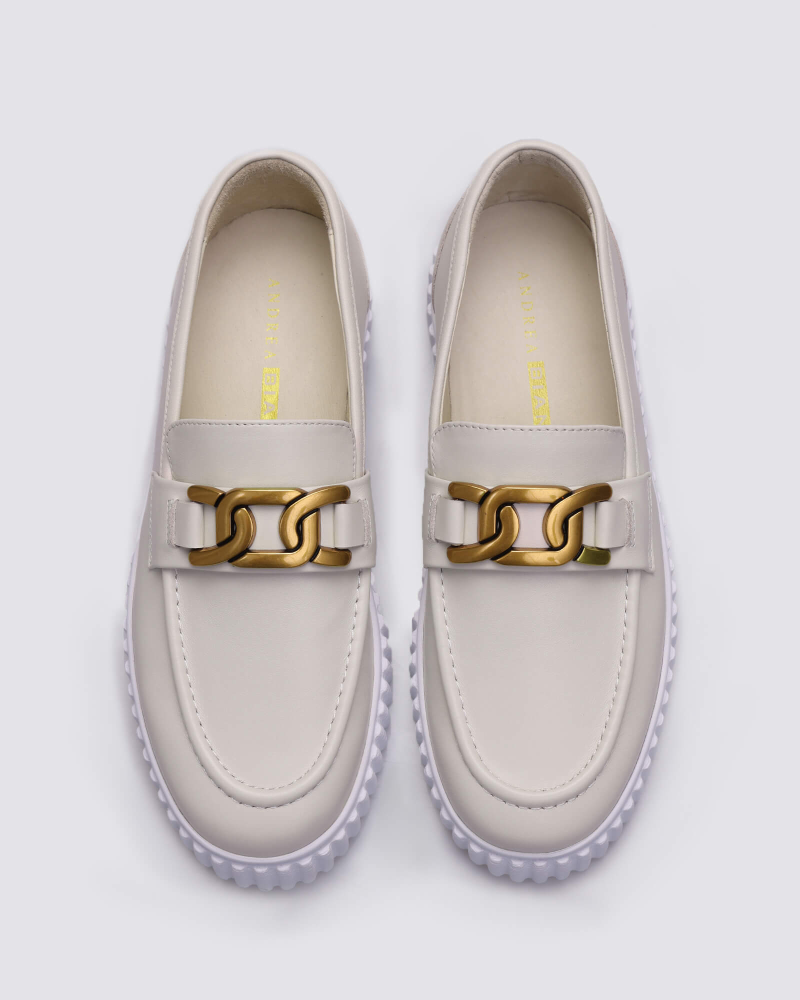 Refined yet relaxed, the Ique Brass Loafer in almond by Andrea Biani is your go-to for smart-casual dressing. Featuring a sleek leather upper and a sport-inspired rubber sole, it’s designed for comfort on the move. A polished brass bar detail across the front adds a touch of shine, while the slip-on design keeps things easy and fuss-free.