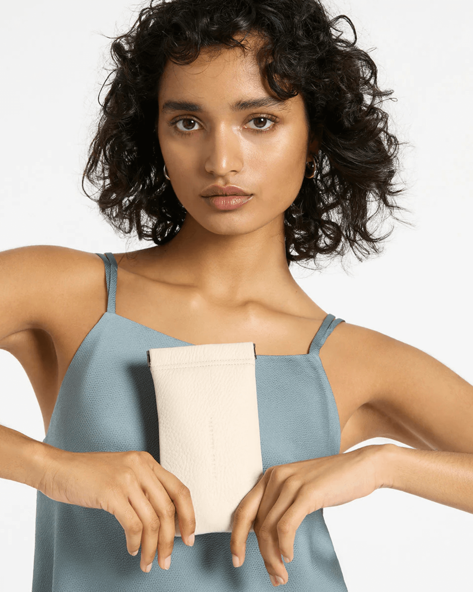 The Keepsake Sunglasses Case by Status Anxiety in chalk leather protects eyewear with soft lining and pinch top, crafted from reclaimed leather offcuts for eco-minded shoppers. A minimal yet functional case for everyday use, the Keepsake Sunglasses Case slips easily into handbags or backpacks.