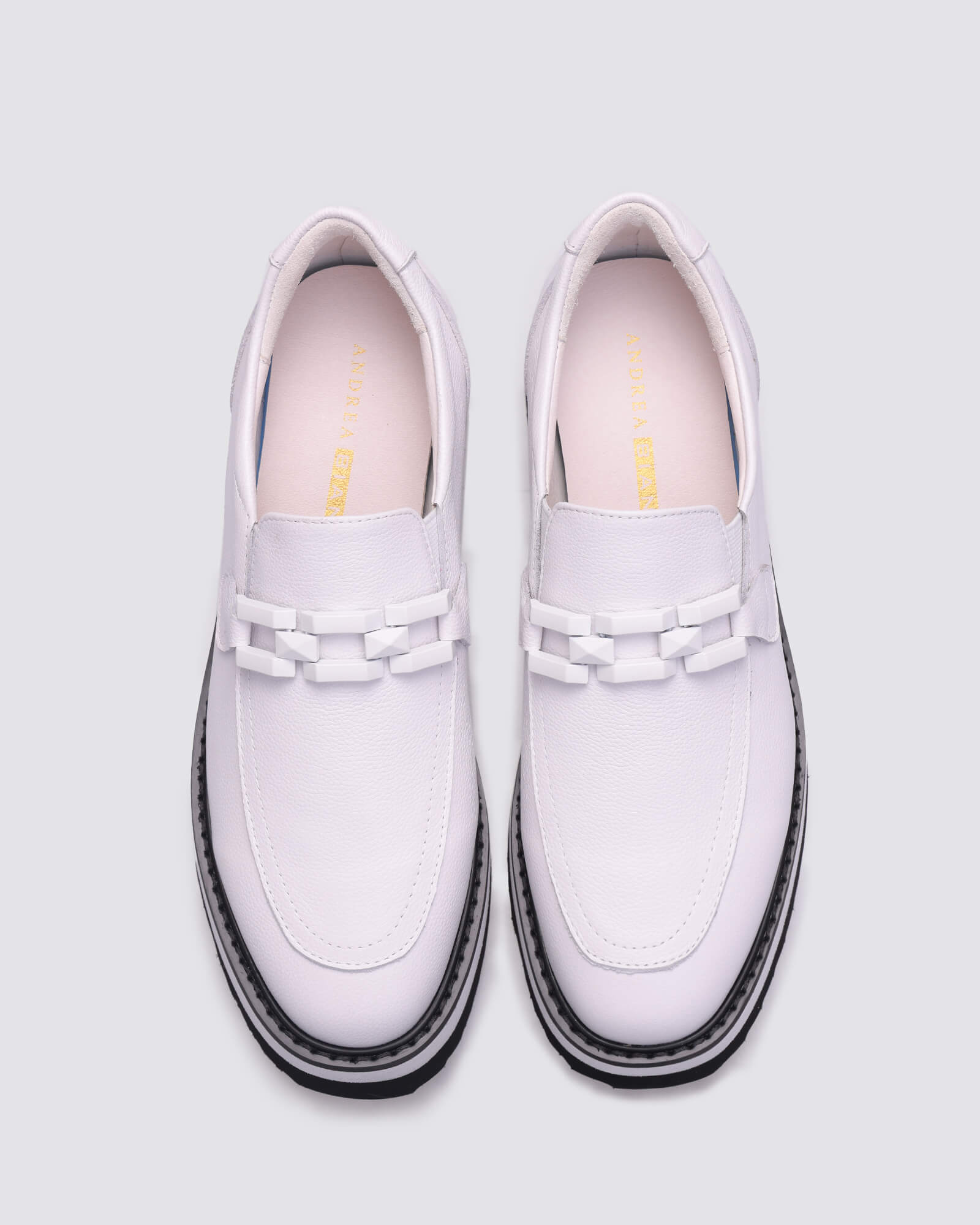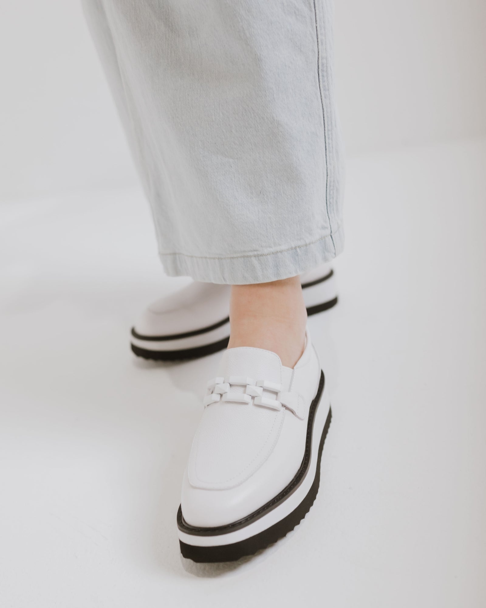 Kimber in White reimagines the loafer with attitude. A chunky contrast sole brings playful edge, while the crisp leather upper keeps things polished. Finished with a bold chain detail across the vamp, this loafer steps confidently into both casual and elevated looks. A fresh option for year-round outfitting—designed in New Zealand, worn everywhere.
