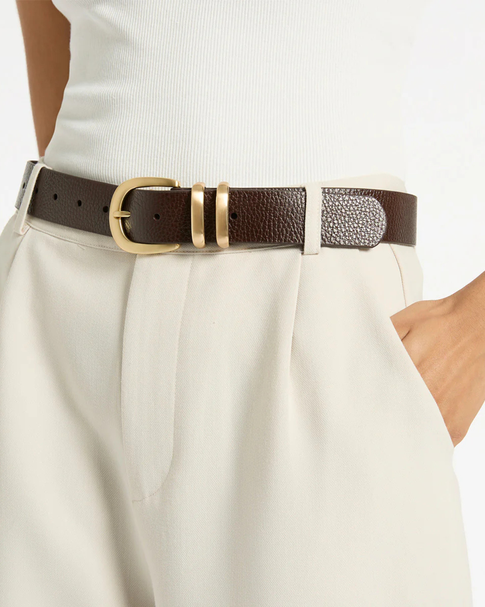 The Let It Be Belt by Status Anxiety in choc/gold full-grain leather features premium hardware, 10-hole adjustability, and timeless styling. An understated essential, the Let It Be Belt elevates both jeans and tailored trousers. The rich chocolate leather and gold-tone hardware add polish to casual looks or smart outfits, making it a must-have!