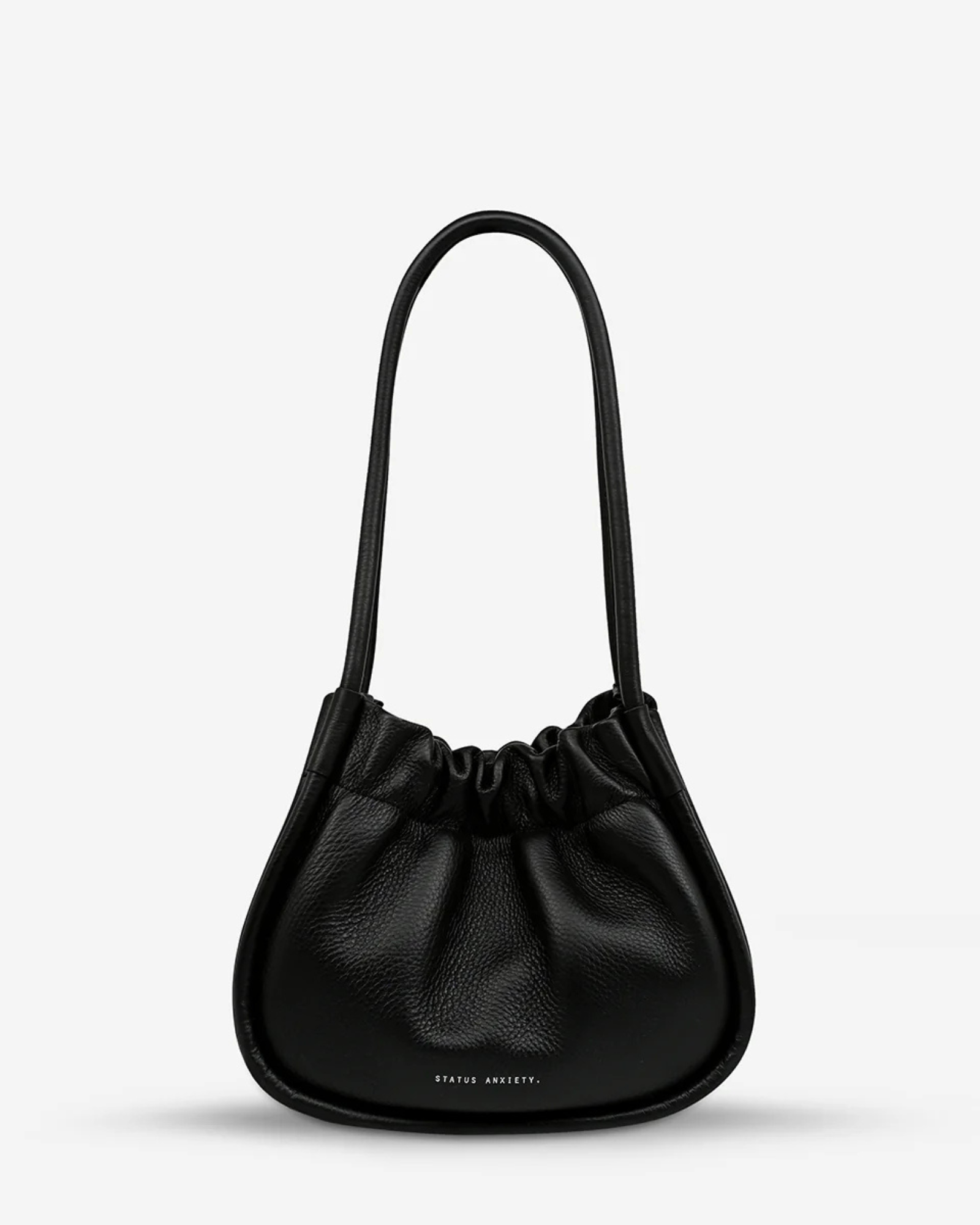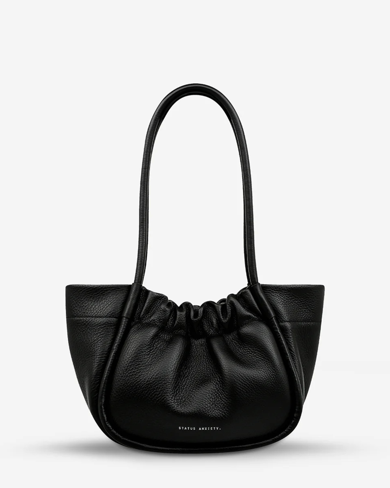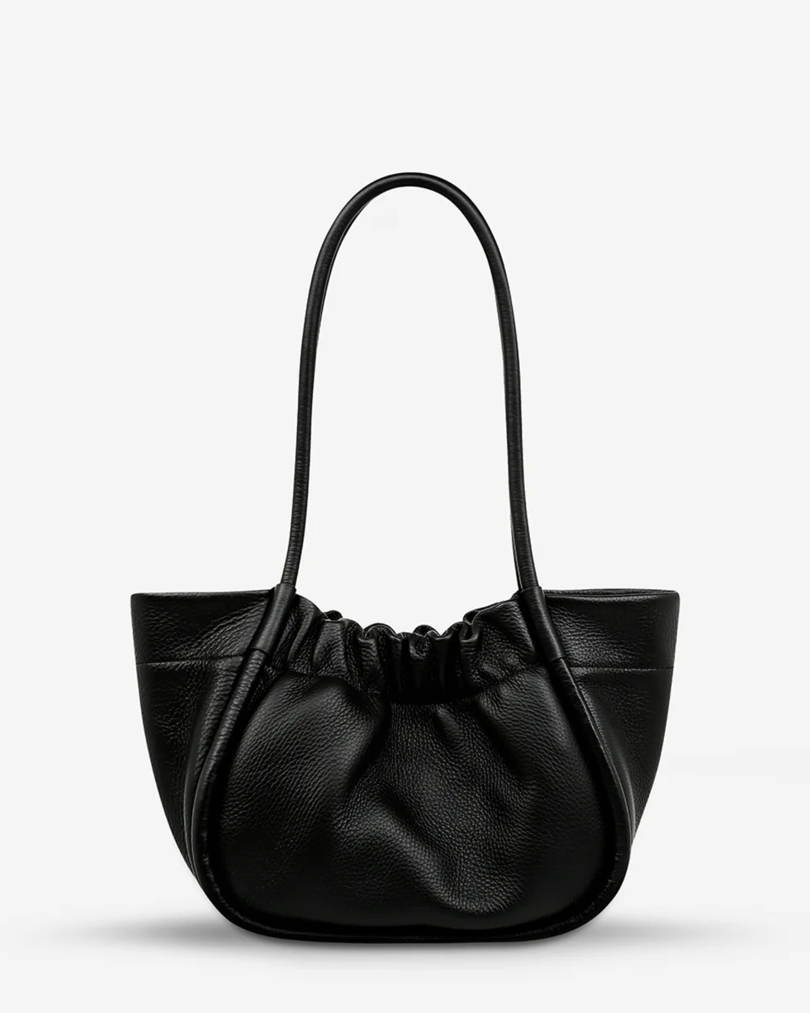 The Ordinary Pleasures Bag in Black blends soft pebble leather with rope shoulder straps and a gathered top that adjusts between structured or rounded silhouettes - an everyday staple.