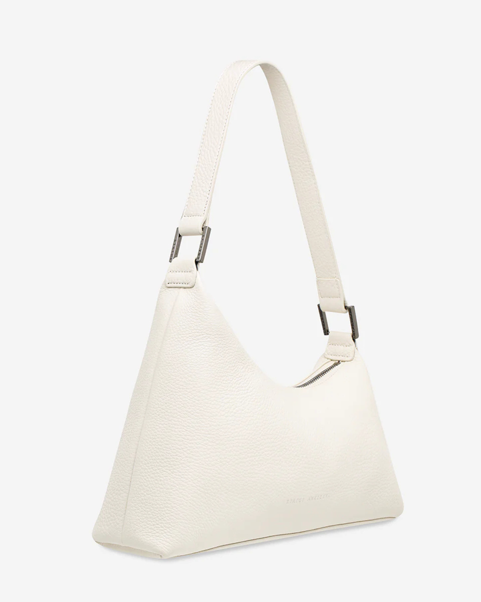 Reverie features an asymmetrical shape crafted in soft pebble leather, giving it a sculptural look that sits comfortably under the arm while remaining practical for daily use.