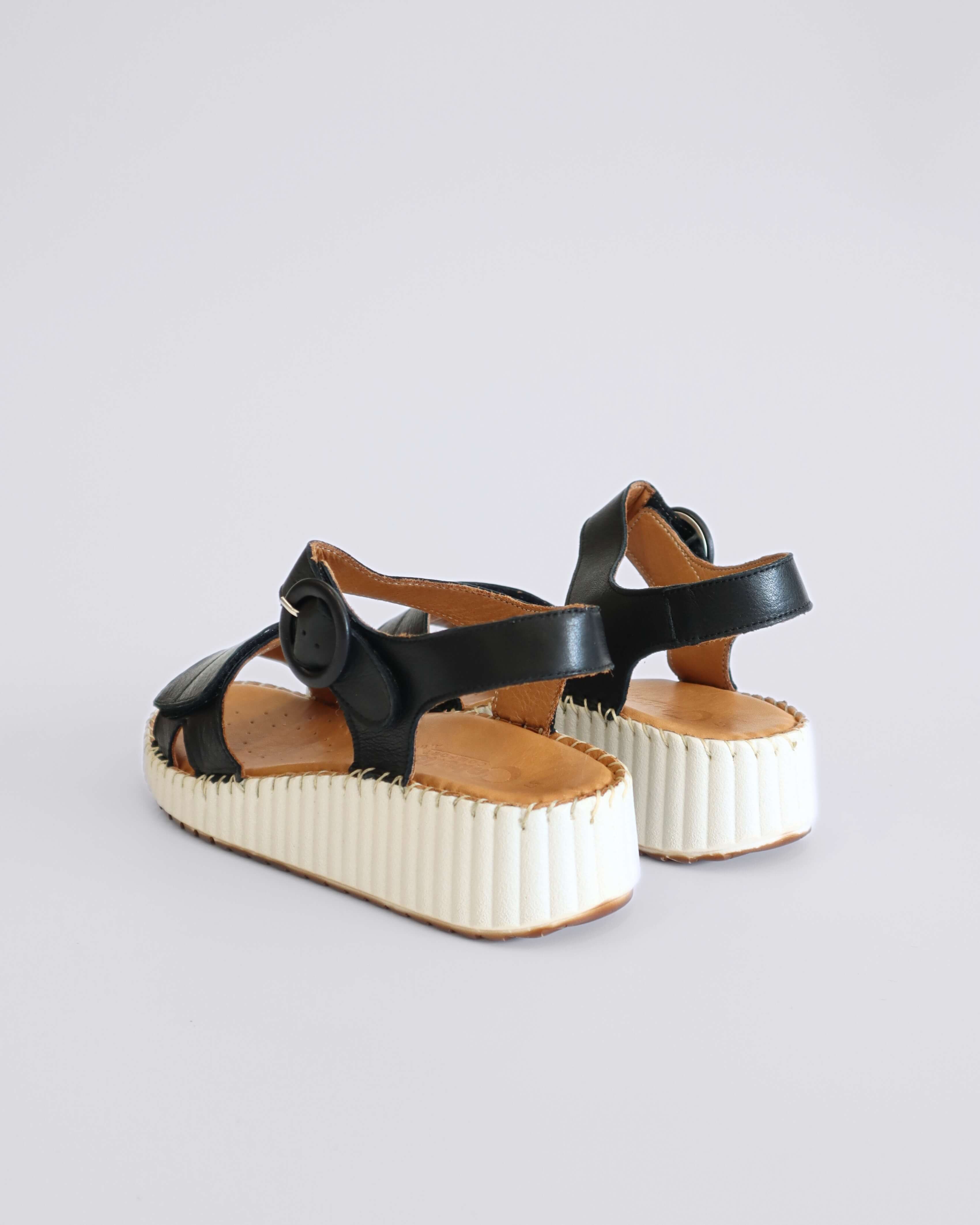 Cabello Tina wedge sandals in Black combine soft leather, adjustable Velcro straps, and a 5cm wedge heel - perfect for women seeking all-day comfort and style.