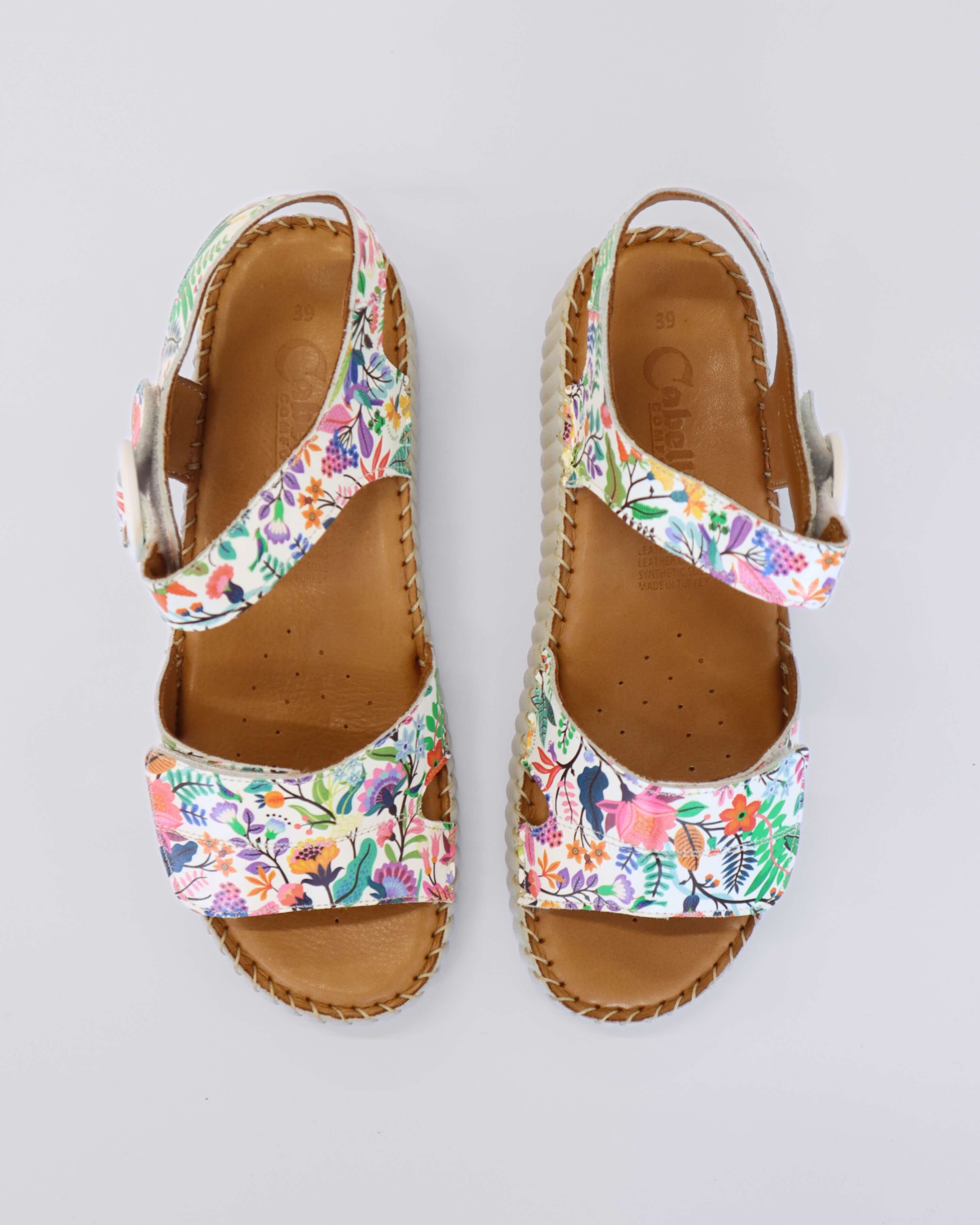 Cabello Tina Floral wedge sandals combine vibrant floral leather, adjustable Velcro straps, and a 5cm wedge heel - perfect for women seeking all-day comfort and style.