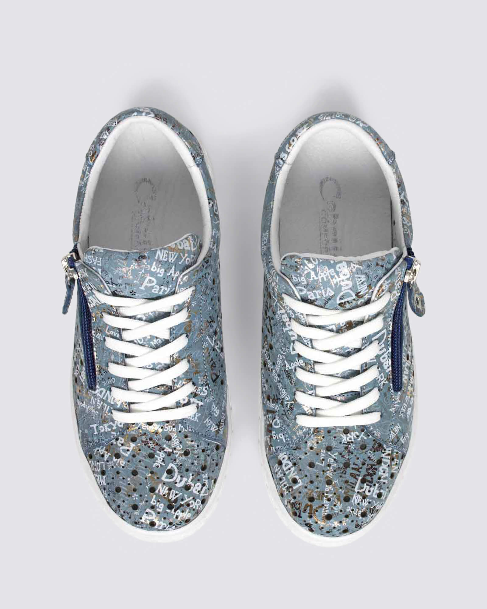 Introducing Cabello’s Uptown sneaker in Jean Print - designed with a decorative punched leather upper, this orthotic-friendly style blends breathability with modern flair. A dual lace and zip closure offers secure and easy wear, while the removable cushioned insole ensures lasting comfort. Perfect for summer strolls or weekend getaways!