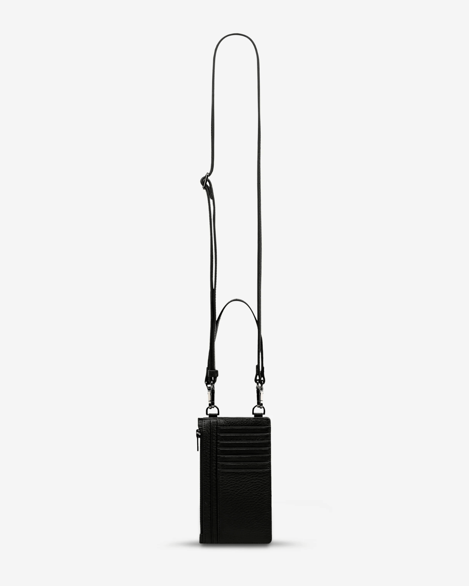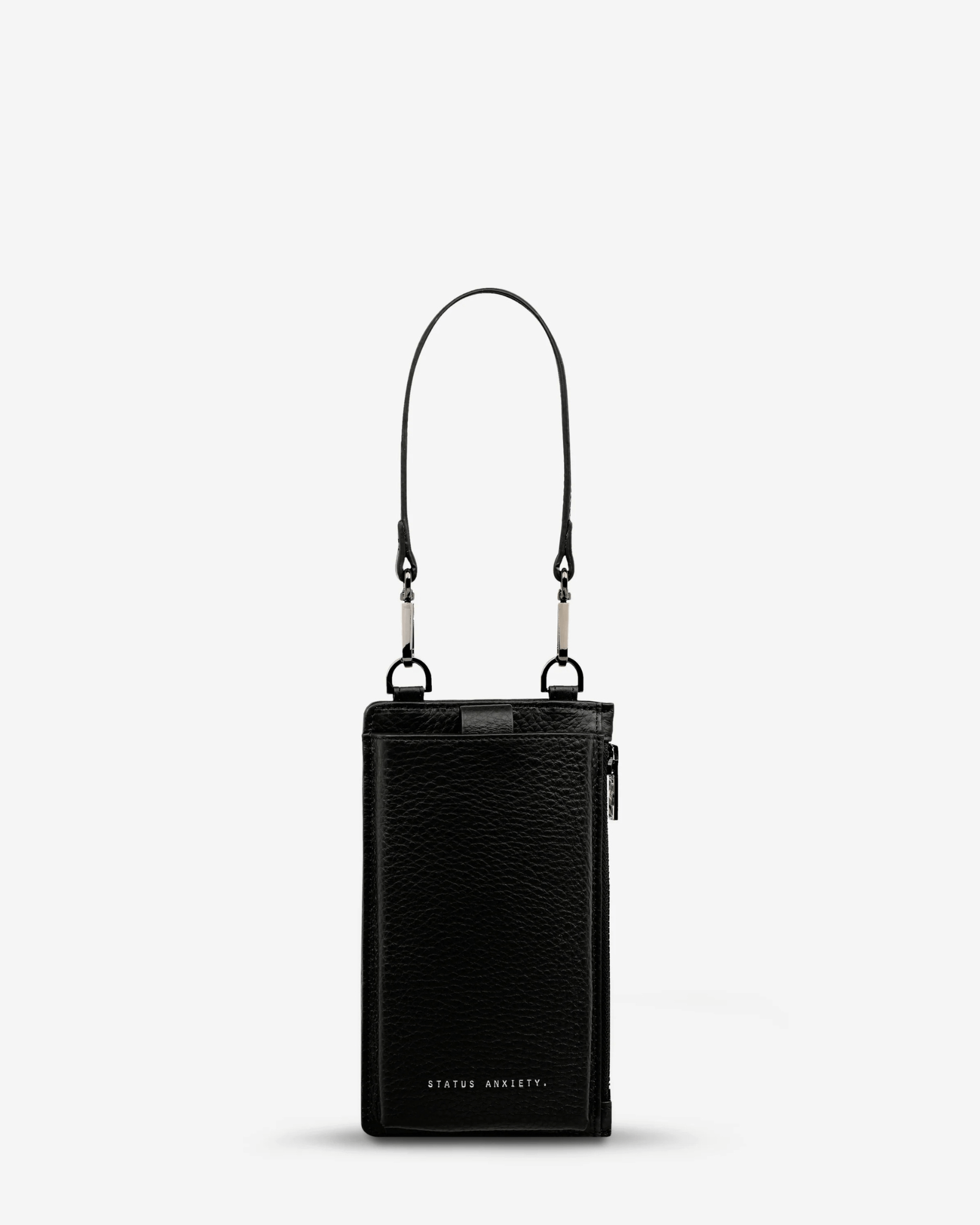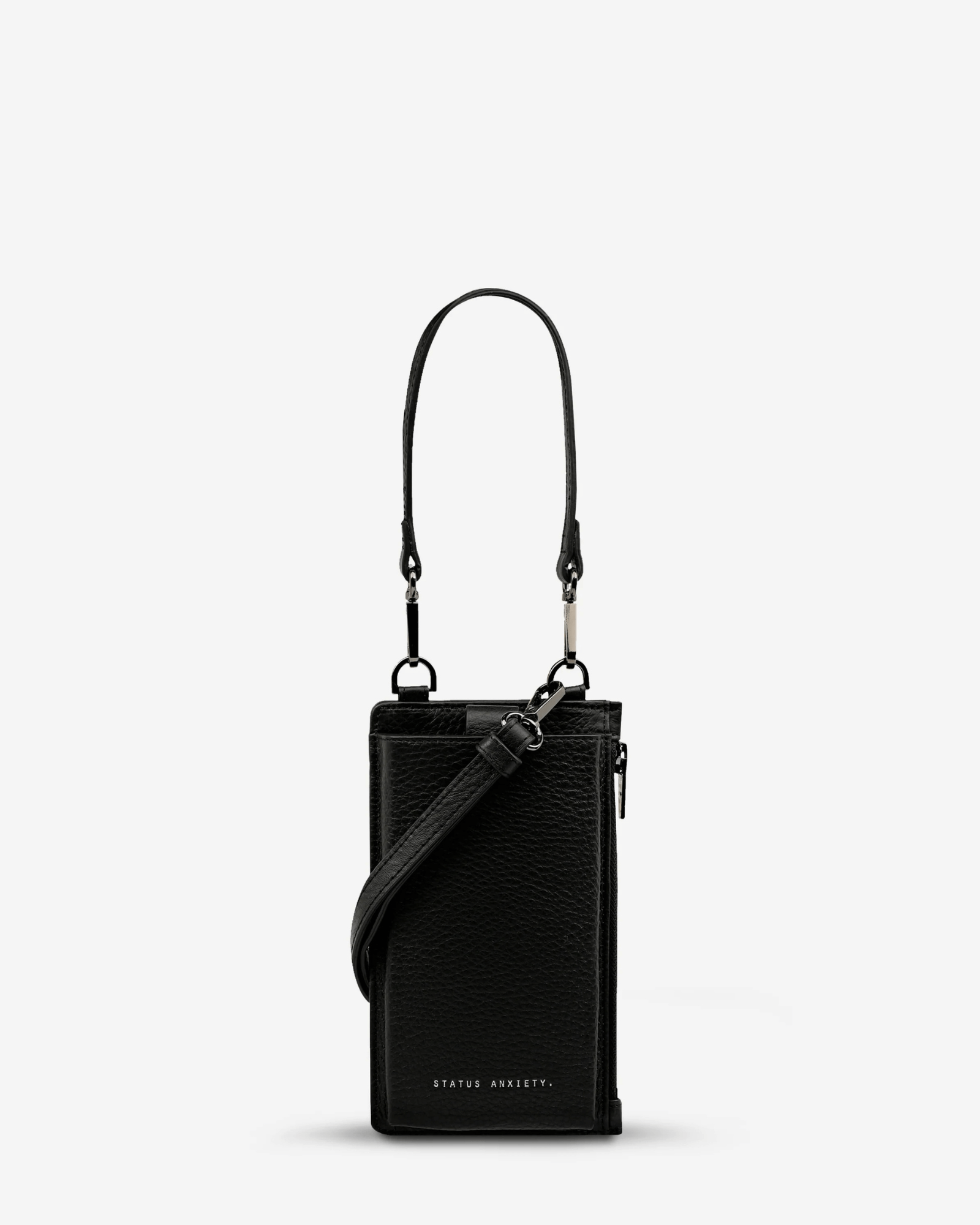 The Voyager Bag by Status Anxiety is a black leather crossbody bag that doubles as a wallet and phone case, with padded phone pocket and card slot. The Voyager Bag is perfect for busy streets or weekends, slipping effortlessly from day to night. Pair with casual jeans, tailored jackets, or weekend dresses - the sleek black leather complements any urban wardrobe while keeping essentials secure.